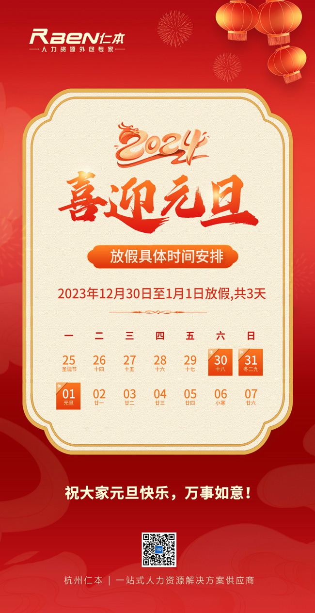 放假時(shí)間:2023年12月30日(周六)至2024年1月1日(周一),共計(jì)3天。2024年1月2日(周二)正常上班。