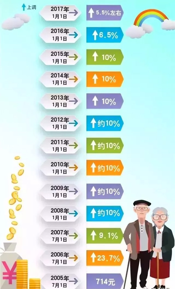 一、養(yǎng)老金十四連漲,2018年漲幅5% 此次調(diào)整,繼續(xù)統(tǒng)一采取定額調(diào)整、掛鉤調(diào)整與適當(dāng)傾斜相結(jié)合的調(diào)整辦法。定額調(diào)整體現(xiàn)社會公平,同一地區(qū)各類退休人員調(diào)整標(biāo)準(zhǔn)基本一致;掛鉤調(diào)整體現(xiàn)“多繳多得”“長繳多得”的激勵機制,使在職時多繳費、長繳費的人員多得養(yǎng)老金;適當(dāng)傾斜體現(xiàn)重點關(guān)懷,主要是對高齡退休人員和艱苦邊遠地區(qū)退休人員等群體予以照顧。 自2005年以來,我國養(yǎng)老金已連續(xù)上調(diào)14年,實現(xiàn)“十四連漲”。此次調(diào)整預(yù)計將有1.14億名退休人員受益。
