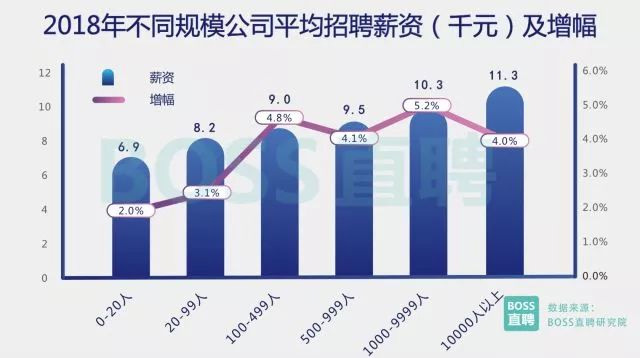 為了緩解人才招聘困境,具有一定實(shí)力的中等規(guī)模公司開始通過調(diào)整薪資爭搶人才,這一幕和4年前移動 互聯(lián)網(wǎng)創(chuàng)業(yè)大潮剛剛開始的時(shí)候十分相似。2018年,100-499人規(guī)模的企業(yè),平均薪資增幅為4.8%,高于一萬 人以上規(guī)模的巨頭,僅次于處在最旺盛發(fā)展階段的1000-9999人企業(yè)。