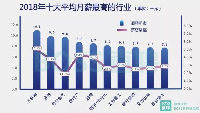 隨著第三產(chǎn)業(yè)在我國GDP中所占比重的連年提升,特別是城市服務(wù)業(yè)的迅猛發(fā)展以及社會消費(fèi)意愿的提升, 不僅僅是一線城市,二三線城市的生活服務(wù)業(yè)同樣出現(xiàn)較大的崗位空缺,“用工荒”現(xiàn)象在開年后較為明顯。 而在求職旺季,工程施工相關(guān)人才的相對緊缺,一定程度上反映出“一帶一路”大背景下,基建項(xiàng)目整體需求的提升,以及基建投資在今年“降速提效”的新特征。 產(chǎn)業(yè)間薪酬分化進(jìn)一步加劇 BOSS直聘研究院數(shù)據(jù)顯示,2018年前兩個月,各產(chǎn)業(yè)間平均薪資水平的分化進(jìn)一步加劇,排名第一的互聯(lián) 網(wǎng)行業(yè),平均薪酬是排名末尾的食品/飲料行業(yè)的1.79倍,較2017年同期增加0.06倍。 傳統(tǒng)高薪三巨頭行業(yè)互聯(lián)網(wǎng)、金融、專業(yè)服務(wù)穩(wěn)坐前三,平均月薪較其他行業(yè)高出1000元以上。 房地產(chǎn)、通信互換位置,排名四五, 雖然在薪資基數(shù)上與前三仍有差距,但薪資增幅僅以微弱劣勢稍低于互聯(lián)網(wǎng)。