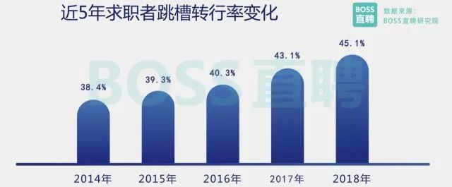BOSS直聘研究院發(fā)現(xiàn),石油/石化和采掘/冶煉行業(yè)人才的流入/流出比連續(xù)三年下降,2018年跌破0.75。 而過去幾年人才吸引力尚能保持在中游位置的傳統(tǒng)媒體,人才流失率首次進(jìn)入倒數(shù)五位。 人才轉(zhuǎn)行情況更加普遍 產(chǎn)業(yè)間流動迅速增長 隨著新興行業(yè)的崛起以及行業(yè)間薪酬分化加劇,人才轉(zhuǎn)行率正加速上升。 BOSS直聘研究院數(shù)據(jù)顯示,2018 年,全行業(yè)人才整體轉(zhuǎn)行率已達(dá)45.1%,較5年前增加近7個百分點(diǎn),轉(zhuǎn)行現(xiàn)象正變得愈發(fā)普遍,產(chǎn)業(yè)間的人才流 動正在迅速增長。