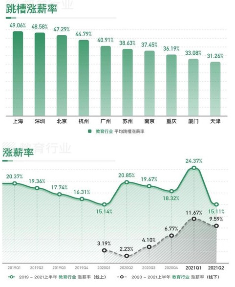 2021上半年互聯(lián)網行業(yè)薪酬數(shù)據 一線城市跳槽漲薪率也回落到35%上下。正式宣告疫情對于互聯(lián)網的影響宣告結束,一切回歸平常。 這一波大起大落,算是在極短時間經歷了行業(yè)危機、新風口出現(xiàn)、瘋狂搶人、行業(yè)洗牌、回歸正常。一場大戲,再次證明了,只有潮水褪去才知道誰在裸泳,精彩絕倫,能夠看到一次何其有幸,但還是希望疫情這樣的危機不要再出現(xiàn)了。 2、 教育行業(yè) 相較于其他行業(yè)的“獨角戲”,教育行業(yè)簡直是雙主角模式,而且兩位主角的境遇可謂一個天堂、一個地獄。這兩位主角分別是線上教育、和線下教育。