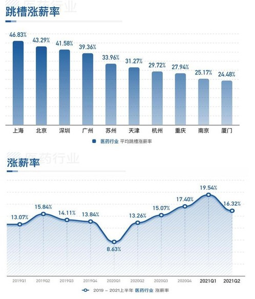 2021上半年教育行業(yè)薪酬數(shù)據 疫情對于線下教育的打擊算是一擊致命,一瞬間致死,毫無還手之力,加之國家對于課外培訓的打擊力度, 2020年四個季度的漲薪率瞬間從2019年的平均15%上下,跌至3.19%、2.23%、4.10%、6.77%,線下教育迎來了至暗時刻。與此同時,線上教育板塊,瞬間引來爆發(fā)。原來被大家嫌棄的沒有學習氛圍、效率低下、專業(yè)度不夠等等缺點,統(tǒng)統(tǒng)變成了“真香”。所以薪智人經常說,沒有差的模式,只有沒找對的應用場景。此輪爆發(fā)過于突然,市場相關人才儲備非常不足,搶人大戰(zhàn)使得2020年線上教育漲薪率達到了15.14%、20.85%、19.67%、18.32%。 隨著疫情的影響逐漸減退,線下教育市場開始回暖,國家嚴控課外培訓,大家就開始轉型興趣培訓,在“被憋瘋”的家長和小朋友的推動下體育類、音樂類、美術類培訓迎來爆發(fā)。市場薪酬漲薪率也在2021年第一、第二季度回到了11.67%、9.59%,雖然沒有回到2019年的平均水平,但是勢頭回來了,面包總會有的,一切都會有的。反觀線上教育,可謂“一地雞毛”,亂象叢生,經歷了洗牌,行業(yè)也逐漸回歸理性,2021年第二季度漲薪率也回到了15.11%。 但是,說教育行業(yè)已然完全回歸理性還為時尚早,北上深的跳槽漲薪率依然高達近50%,這還是非常不正常的數(shù)據,希望線上教育能借勢蓬勃發(fā)展,而不是“作繭自縛”。 3、 醫(yī)療、醫(yī)藥行業(yè) 疫情一來,醫(yī)療、醫(yī)藥行業(yè)讓大家看到:什么叫國之重器啊?(戰(zhàn)術后仰)。在此先向所有疫情期間奮戰(zhàn)在一線的醫(yī)務人員、疫苗研發(fā)的一線工作人員致以最高敬意,感覺討論漲薪率真的貶低了大家的貢獻。 但畢竟數(shù)據解讀,還是要看一下市場數(shù)據,2021年第一、第二季度的漲薪率達到了19.54%、16.32%,這個數(shù)據說明醫(yī)藥行業(yè)的熱度還沒有褪去,從跳槽漲薪率北上深都超過40%也可以證明。