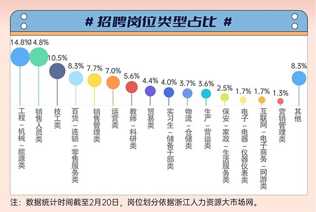 不只有常見的崗位,統計還發現,本次“新春引才服務月”活動中還有諸如“白領育兒師”“養老規劃師”“健康管理師”等新興職業引關注。如有公司擬招聘20位“白領育兒師”,以“指導寶媽科學母乳喂養的方法”;有公司擬招聘10位“廢舊辦公家具回收與再利用技術”方向的博士,重點“研制木質家具一體成型”等技術……小眾新興職業需求讓就業市場的生態更加多元和豐富。 錯過招聘會還有機會嗎? 云招聘、直播帶崗等形式打破限制 剛在網上看到適合自己的心動企業、心動崗位,卻發現招聘會已經結束?別擔心,杭州“新春引才服務月”活動剛剛過半,還有9場活動在等著你。這幾場活動大都是線下招聘會,舉辦地主要集中在杭州市人才市場(環城北路167號匯金國際D座),時間均為當天9時至12時。其中,3月1日將在杭州大會展中心舉辦的2025“起跑春天”杭州青年人才交流大會規模最大,參與企業超800家,覆蓋智能物聯、高端裝備、生物醫藥等領域。 梳理還發現,這次有超百家企業參與了不止一場的招聘會,其中還有4.98%的企業參加了10場(含)以上的招聘活動,查詢企查查發現,這些參與10余場招聘活動的企業多為成立10年內的小微企業,包括浙江省科技型中小企業等,可見這些企業對人才的強烈渴望。