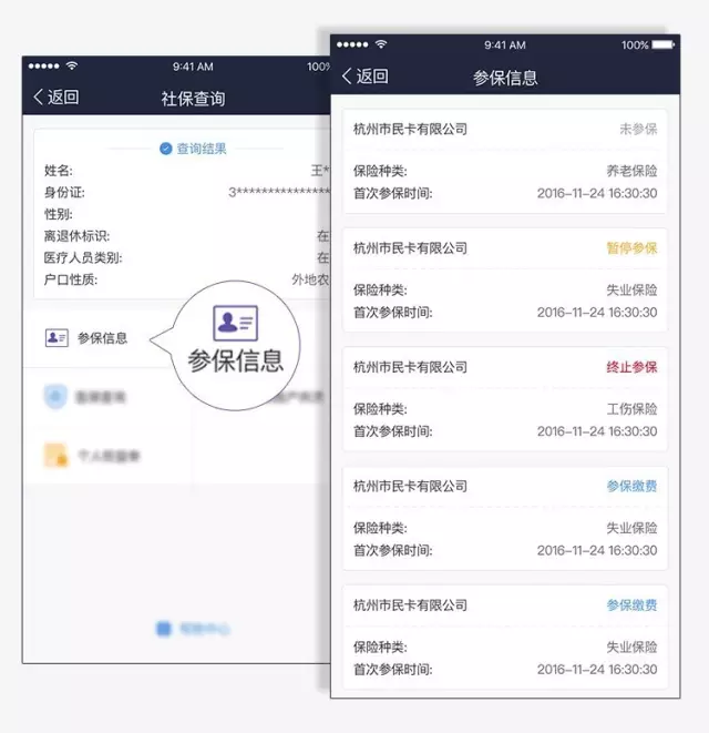 “參保信息”記錄了你在最近一家公司第一次繳納社保的時間和險種類型,快看看你的五險交齊了嗎?