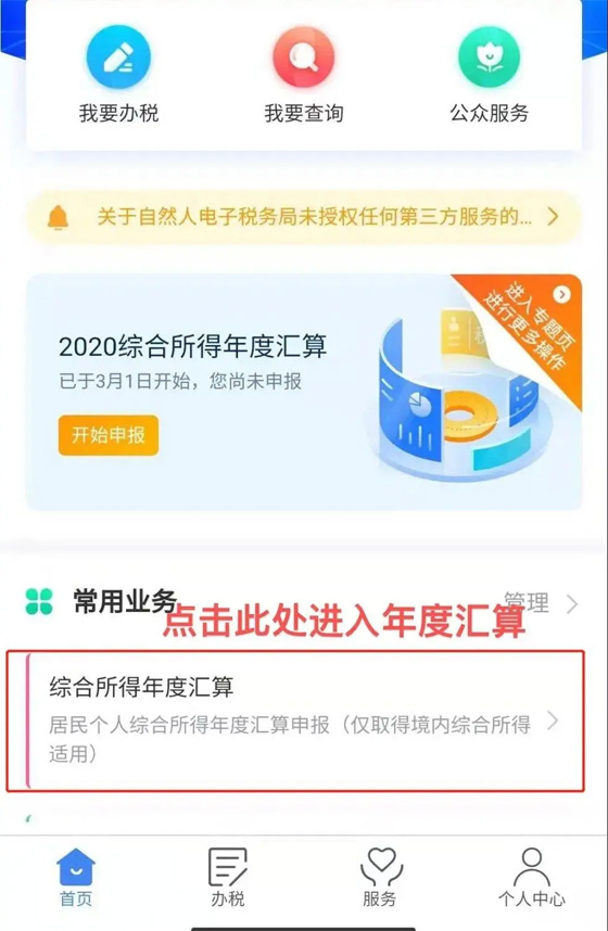 7、以上步驟確認(rèn)無誤之后開始年度匯算首先,在【首頁】找到并進(jìn)入綜合所得年度匯算入口。