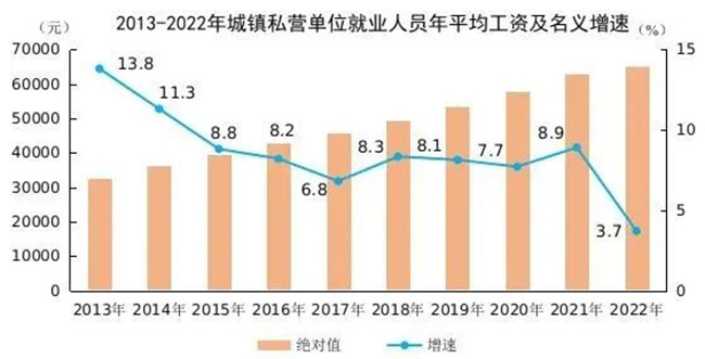 2022年全國城鎮(zhèn)非私營單位就業(yè)人員年平均工資為114029元,比上年增加7192元,名義增長6.7%。扣除價(jià)格因素,2022年全國城鎮(zhèn)非私營單位就業(yè)人員年平均工資實(shí)際增長4.6%。