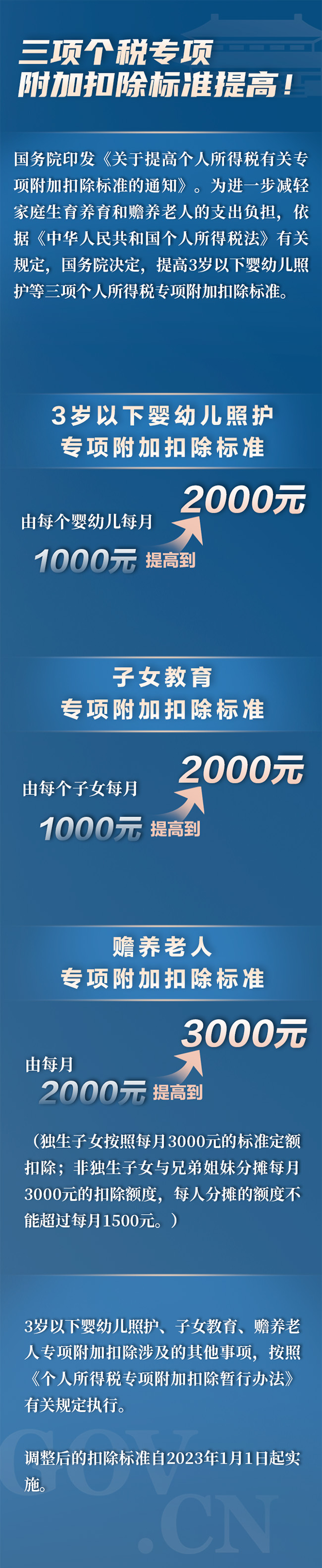 根據《通知》,自2023年1月1日起,3歲以下嬰幼兒照護專項附加扣除標準,由每個嬰幼兒每月1000元提高到2000元。子女教育專項附加扣除標準,由每個子女每月1000元提高到2000元。贍養老人專項附加扣除標準,由每月2000元提高到3000元,其中,獨生子女每月扣除3000元;非獨生子女與兄弟姐妹分攤每月3000元的扣除額度,每人不超過1500元。