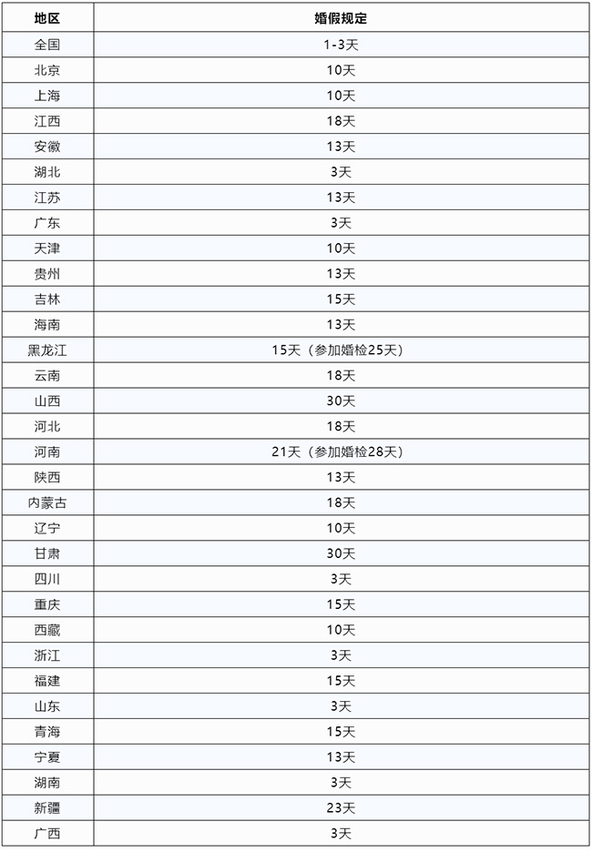 2、國家層面上關于婚假的規定 根據勞動法第四章第五十一條規定: 勞動者在法定休假日和婚喪假期間以及依法參加社會活動期間,用人單位應當依法支付工資。 另外,根據《計劃生育條例》的規定: 1.按法定結婚年齡(女20周歲,男22周歲)結婚的可享受3天婚假。 2.符合晚婚年齡(女23周歲,男25周歲)的將不再享受晚婚假獎勵也只有3天法定婚假。 3.結婚時男女雙方不在同一地方工作的,可視路程遠近給予路程假。 4.在探親假期間結婚的不另給假期。 5.婚假包括公休假和法定假。 6.再婚者與初婚者一樣可享受法定婚假。 關于婚假工資計算方式 在婚假的問題上,雖然國家對職工的休息、休假有規定,但并未明確規定工資計發的標準。 《關于國營企業職工請婚喪假和路程假問題的通知》規定:職工本人結婚可以根據具體情況,由本單位行政領導批準,酌情給予一至三天的婚喪假。 假期在三個工作日以內的,工資照發。在批準的婚喪假和路程假期間職工的工資照發。途中的車船費等,全部由職工自理。 因此在婚假的工資發放標準上,目前還沒有適用于全國的統一規定。 婚假是否有有效期? 1、我國法律并沒有對婚假的有效期做出明確的規定。一般來說,不同的公司會有不同的規章制度來約定婚假的有效期。 2、對于公司來說,一般規定員工一年或是半年之內必須休完婚假,否則視為自動放棄該福利。 3、婚假必須一次性休完,不可單獨分開使用。 3、2023最新版全國婚假一覽表
