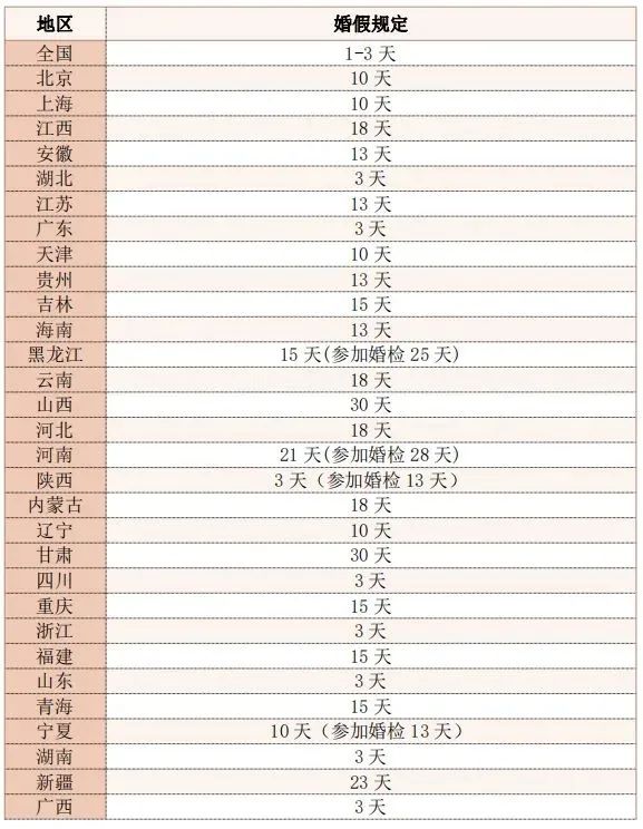 具體內(nèi)容如下: 第一條【立法目的】 為了加快完善積極生育支持措施倡導(dǎo)適齡婚育,保障公民合法權(quán)益,根據(jù)有關(guān)法律、行政法規(guī),結(jié)合本省實(shí)際,制定本規(guī)定。 第二條【適用范圍】 本省行政區(qū)域內(nèi)的國(guó)家機(jī)關(guān)、企業(yè)、事業(yè)單位、社會(huì)團(tuán)體和其他組織等用人單位的職工休婚假,適用本規(guī)定。 第三條【假期天數(shù)】 依法辦理結(jié)婚登記的職工,享受婚假十天;參加婚前醫(yī)學(xué)檢查的,增加婚假三天。國(guó)家法定休假日、休息日不計(jì)入婚假假期。 第四條【假期待遇】 職工休婚假的,工資、獎(jiǎng)金和其他福利待遇照發(fā)。各級(jí)人民政府可以根據(jù)本地實(shí)際,對(duì)落實(shí)婚假制度的企業(yè)等用工單位予以補(bǔ)助、補(bǔ)貼。 第五條【假期管理】 用人單位應(yīng)當(dāng)保障職工休婚假的權(quán)利,落實(shí)職工婚假及其待遇。 職工應(yīng)當(dāng)在登記結(jié)婚之日起一年內(nèi)使用婚假。不能在一年內(nèi)安排休婚假的,經(jīng)用人單位與職工協(xié)商同意,可以延后半年安排婚假補(bǔ)休。