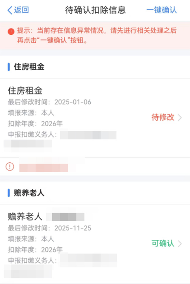 處理好以上情況,再點(diǎn)擊【一鍵確認(rèn)】。 變動(dòng)的場(chǎng)景,例如: 更新?lián)Q工作:需更新扣繳義務(wù)人為新單位(否則新公司無(wú)法獲取扣除) 房貸轉(zhuǎn)租金:先作廢“房貸利息”,再新增“住房租金” 三、2026年專項(xiàng)附加扣除信息有新增 先按照“情形一”的步驟將上一年度不需要修改的專項(xiàng)附加扣除項(xiàng)目確認(rèn),然后新增對(duì)應(yīng)專項(xiàng)附加扣除項(xiàng)目。 |